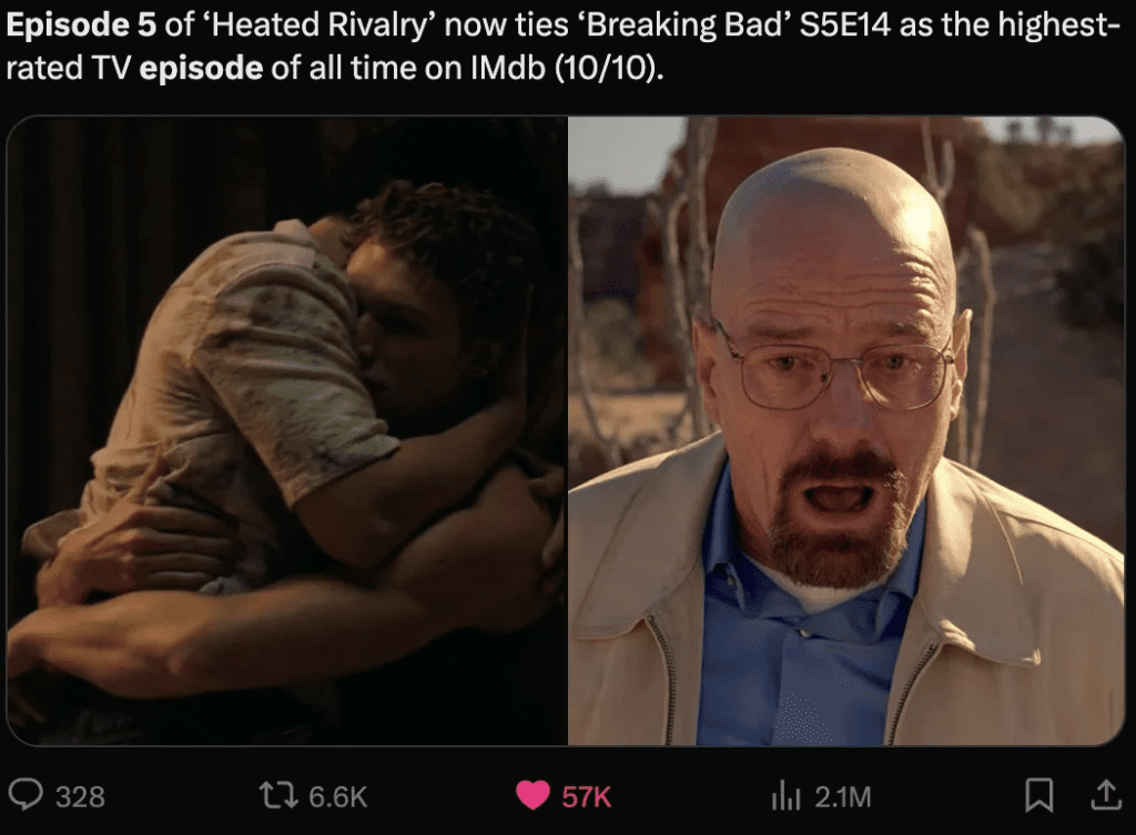 The internet is losing it over Heated Rivalry – the steamy queer hockey romance series that’s become 2025’s biggest TV obsession. And now, Episode 5 (“I’ll Believe in Anything”) has made history with a perfect 10/10 rating on IMDb, tying Breaking Bad’s iconic “Ozymandias” as one of the highest-rated TV episodes ever!